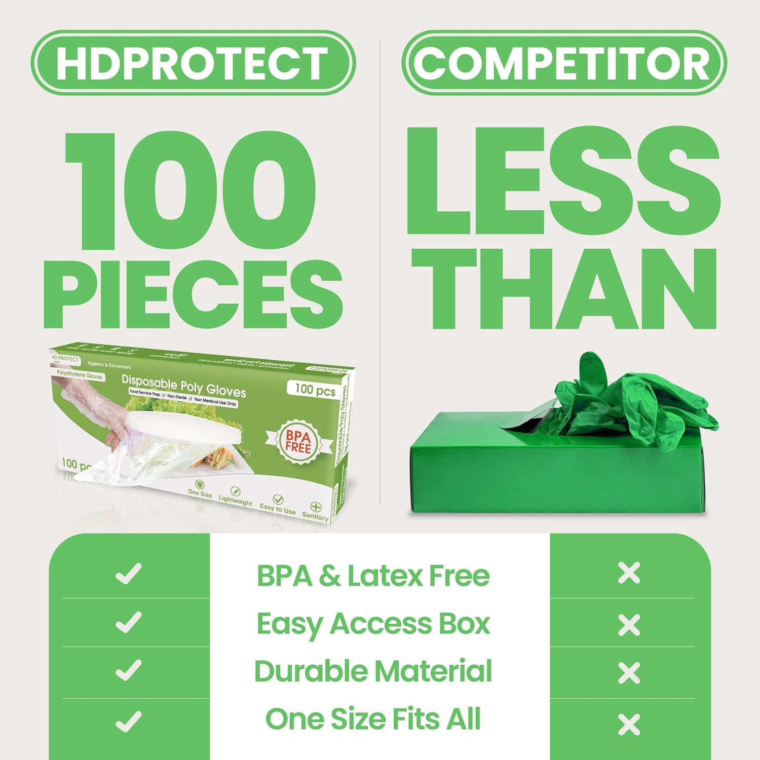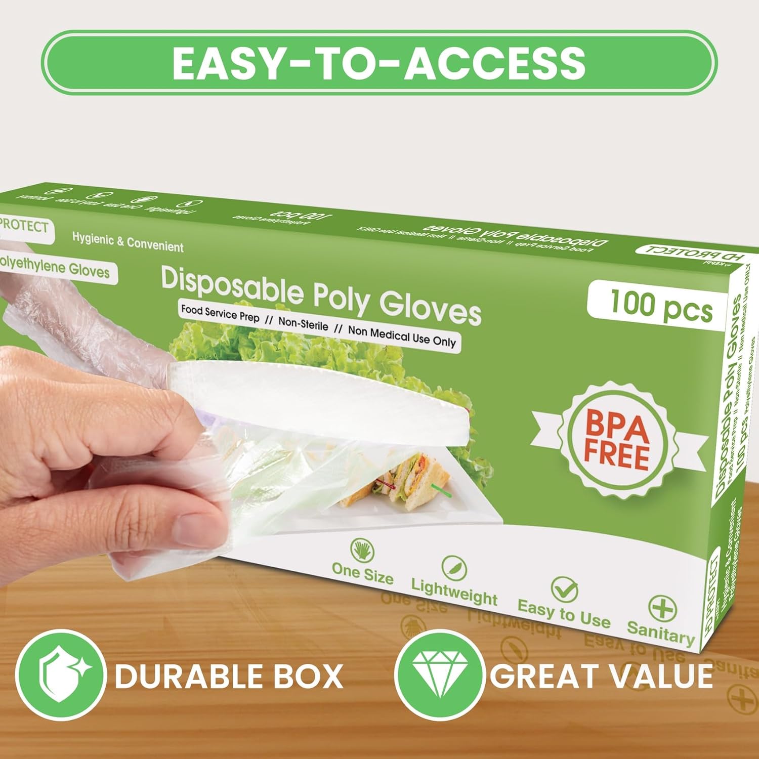 Amazing Value - Confidence that doesn’t break the bank! Our 100pcs pack of plastic gloves for food handling was designed with safety in mind. Packaged in a durable easy-to-acc box, these BPA and latex free gloves are the perfect addition to any kitchen or home!