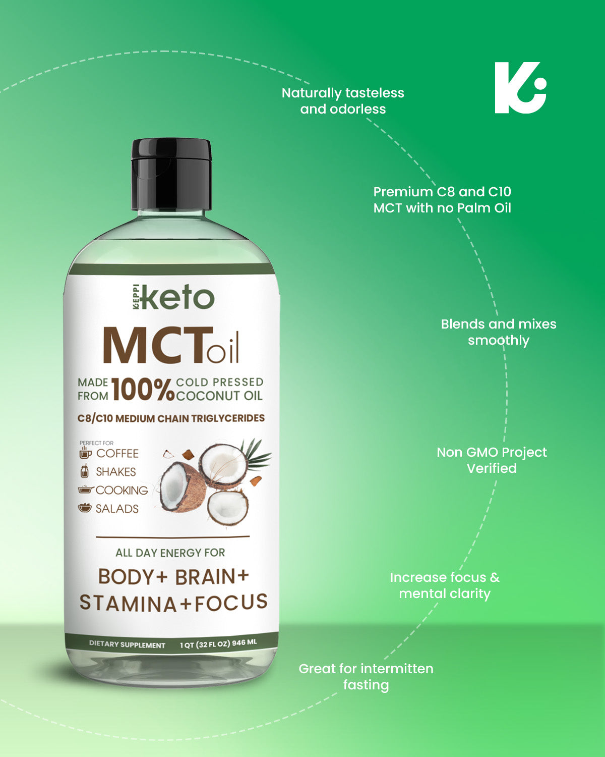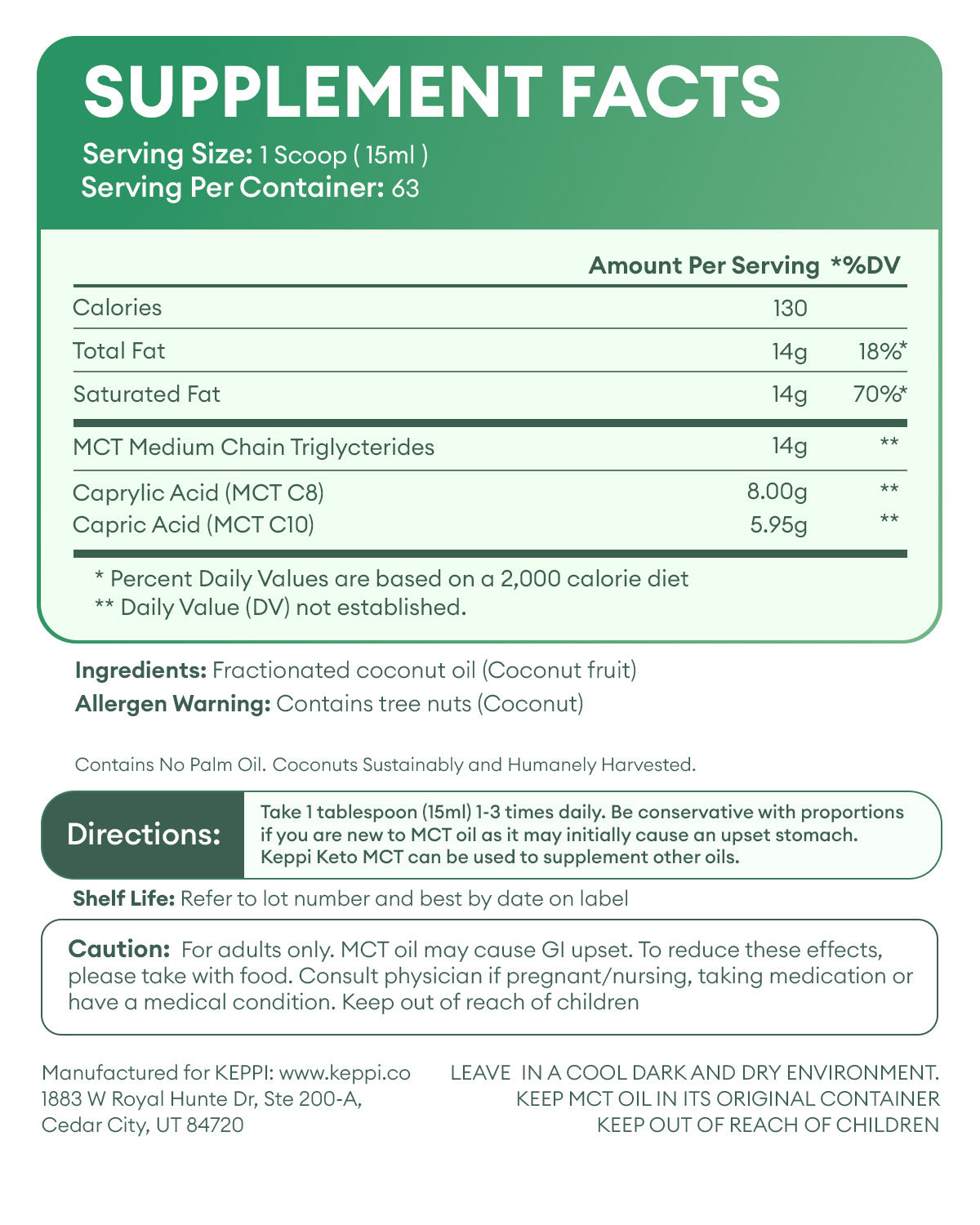 Fuel your mind and body with Keppi C8 C10 MCT Oil — a powerful MCT oil blend crafted from 100% non-GMO coconuts. Our premium mix of C8 and C10 MCTs provides fast, clean energy to help you power through your day, crush cravings, and stay laser-focused on your goals.